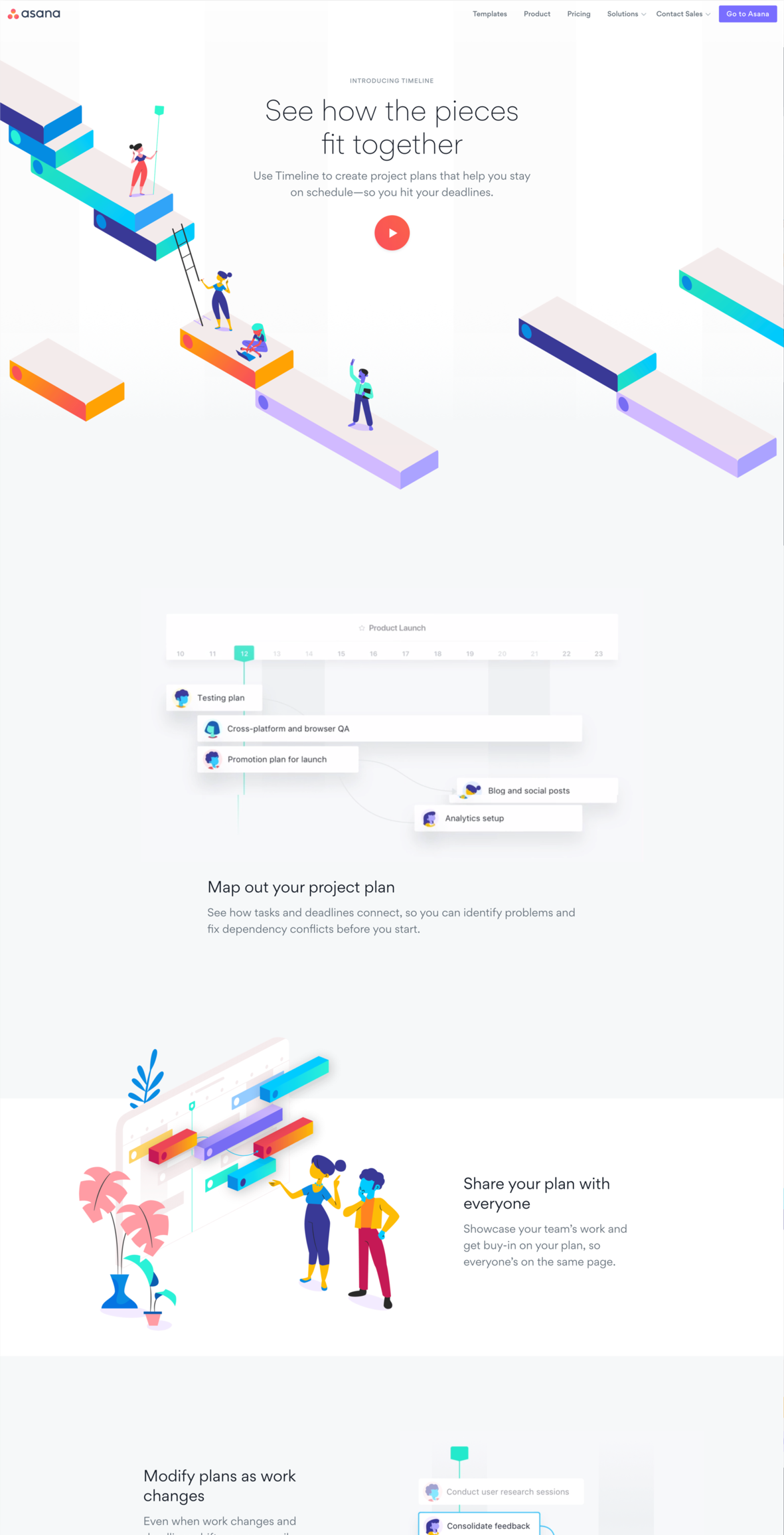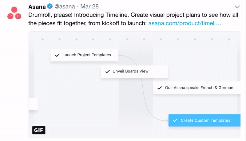 I led creative production on one of Asana’s biggest product feature launches in years—Timeline. The marketing campaign included the creation of four unique videos, ads, social posts, emails, numerous blog posts and guide articles, a landing page and updates to other web pages, and in-person customer trainings. In addition to this, all the marketing materials needed to be translated into five different languages, which was a first for the company.
