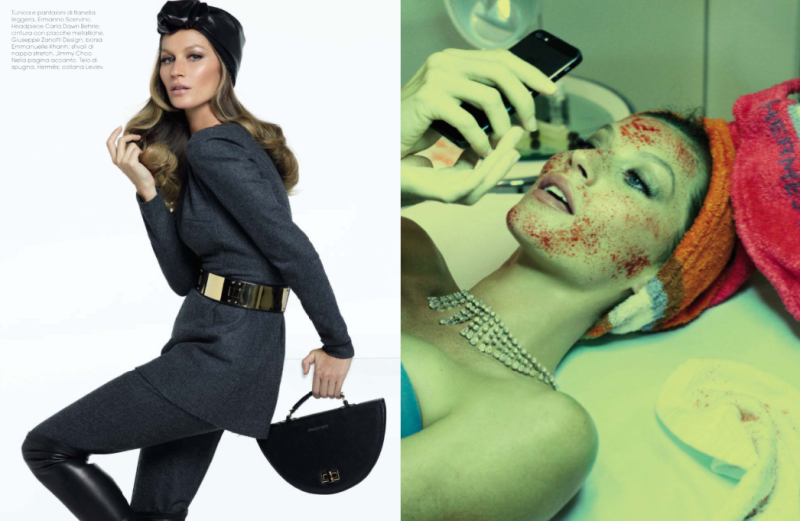The June 2013 cover of Vogue Italia focused on health and beauty, including some more extreme fads like vampire facials. The shoot featured model Gisele Bündchen and was shot by photographer Steven Meisel. As the Art Coordinator for the shoot, I got to have some fun sourcing unique items for the set, like beauty parlor chairs, body suction cups, and materials to replicate both caviar and snail facials (feel free to ask me the details about those!).